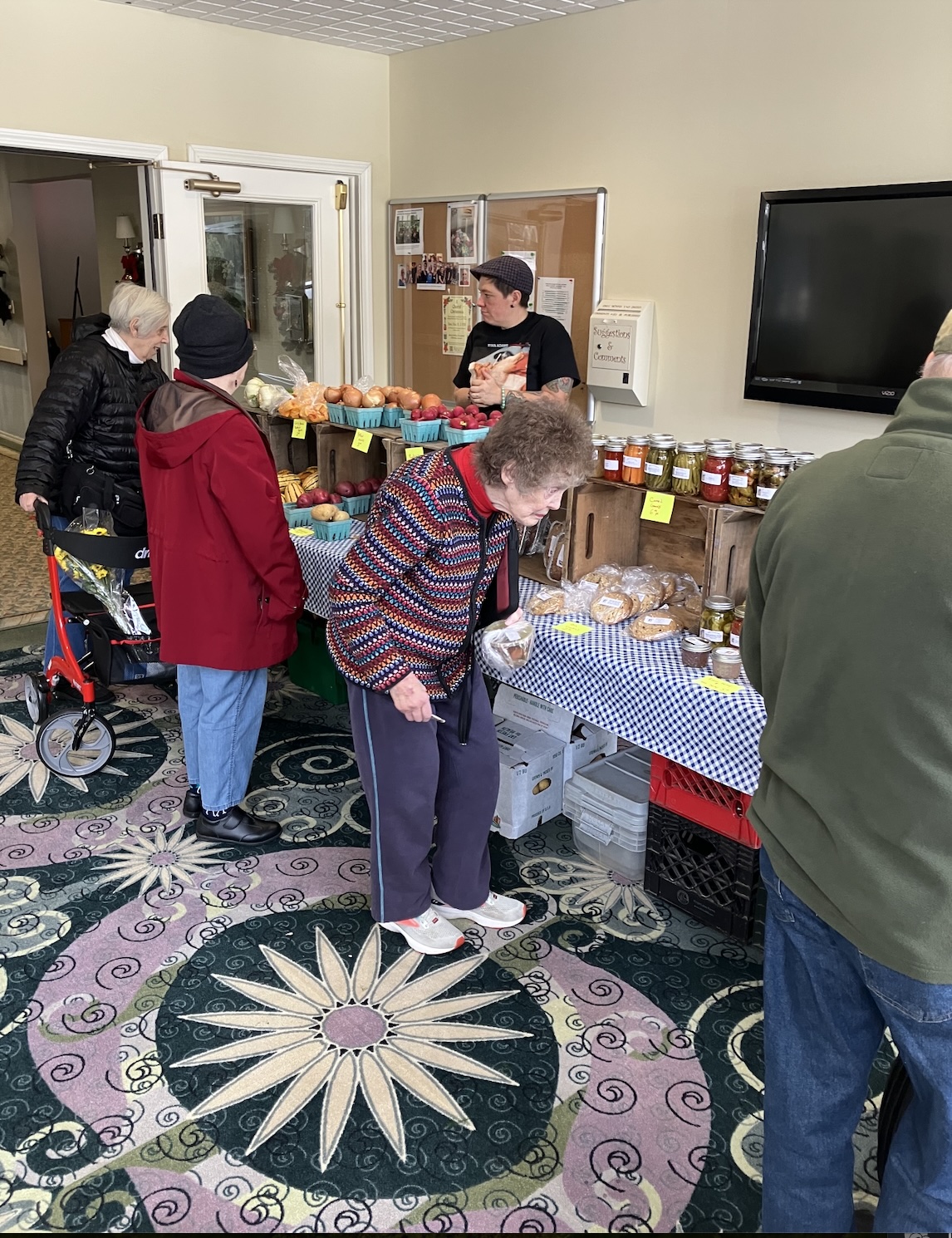 The first snow of winter has fallen and the holiday season has arrived. Even with the new cold temperatures, residents were still able to enjoy a farmers market inside Prestwick. Fresh veggies, home baked breads, jams, sweets and soups were just a few of the wide ranging items offered for purchase to the community. This wonderful activity is always enjoyed by the residents. On a cold icy day they do not need to venture out , other then to meet down in the lobby for the market. Thank you to the ladies who offer this wonderful program to our community.