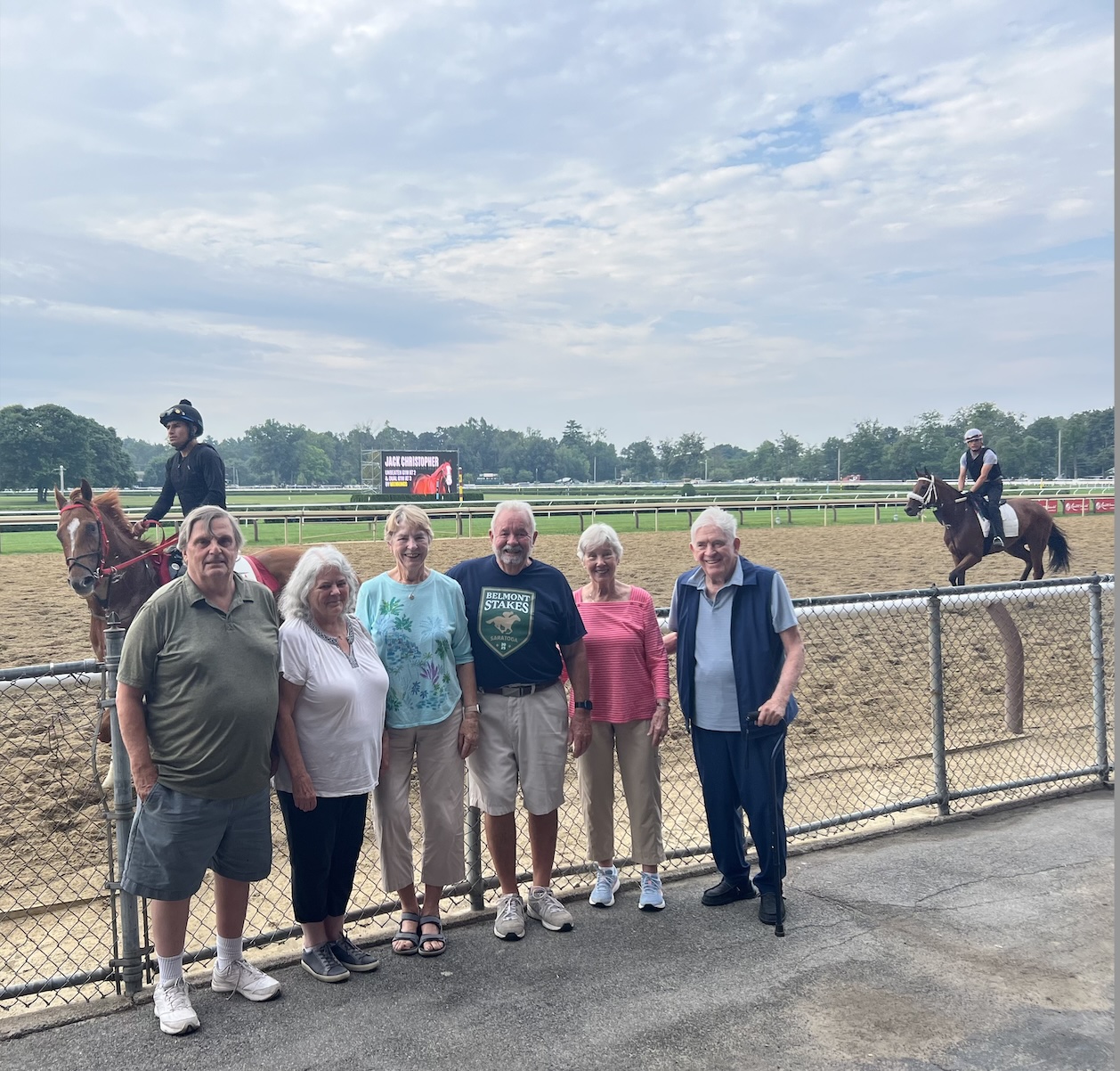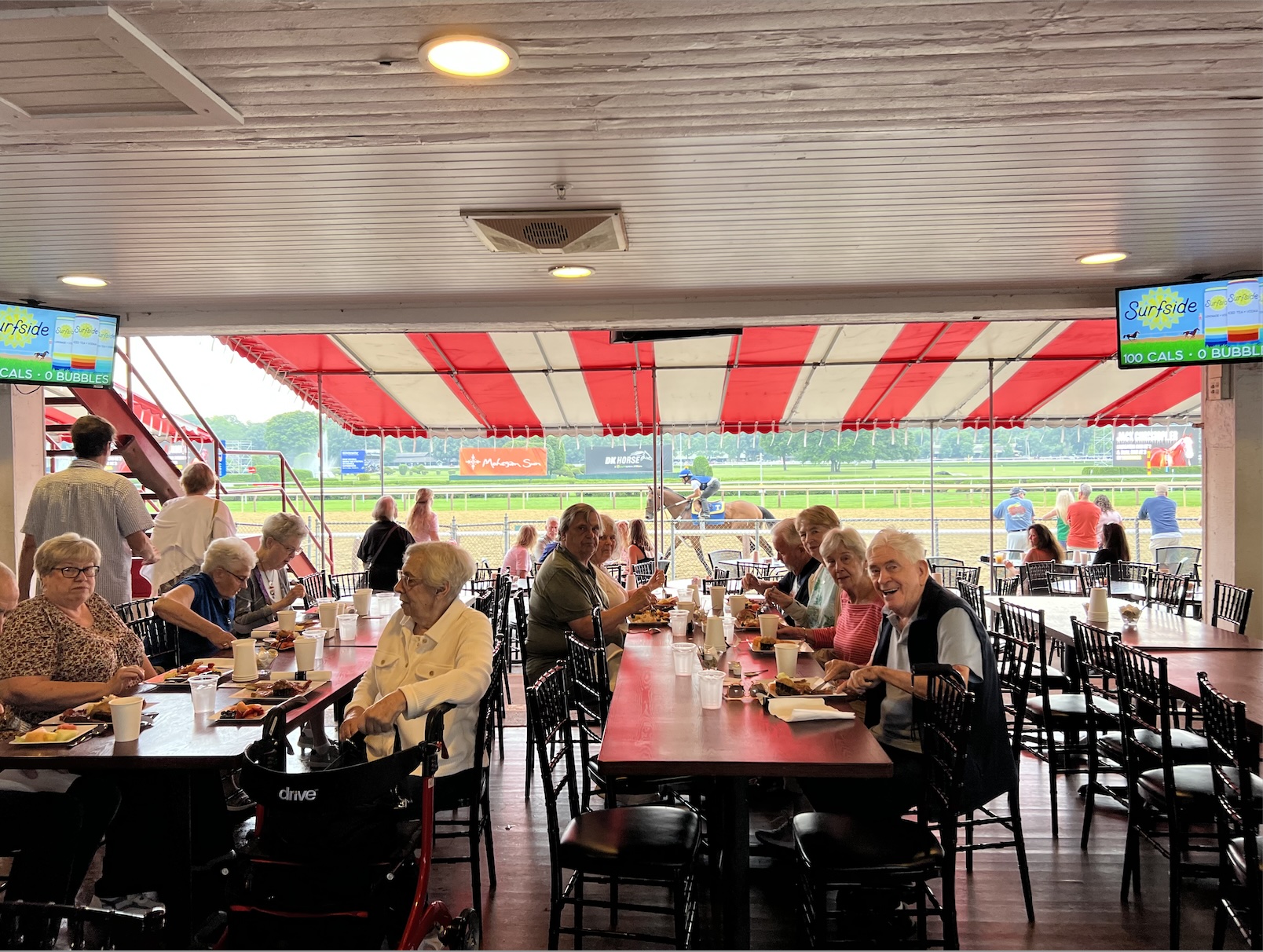 Residents got up very early to enjoy a breakfast put on at the Saratoga Race Track. With the track being so close to Prestwick Chase, what better way to start a summer morning. Watching the jockeys warm up the horses with galloping passes, is truly magical.  The bright flowers, the dark green grass and reddish hue of the dirt on the track is indeed a sight to be seen. What makes this activity so much fun is actually being there before all the crowds rush in to watch Premier Horse Racing.  We love taking our residents over for this delightful way to start their day. Thank you to the staff of the track for their hospitality and for the residents who attended this wonderful tradition in Saratoga.